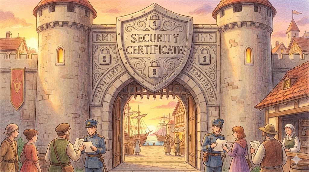 - 해석: (IT/인터넷) 웹사이트가 안전하다는 것을 증명하는 디지털 인증서(SSL 인증서 등)입니다. 이것이 없으면 브라우저에 "안전하지 않음" 경고가 뜹니다.