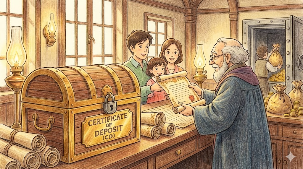 은행에 일정 기간(6개월, 1년 등) 동안 돈을 맡겨두고(Deposit), 만기 때 원금과 정해진 이자를 받는 금융 상품입니다. 일반 입출금 통장보다 이자율이 높지만, 약속한 기간 전에는 돈을 뺄 수 없는(빼면 위약금을 무는) '목돈 굴리기용 저축 상품' 입니다. 줄여서 "CD"라고 부릅니다.