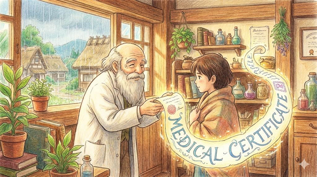 아파서 학교나 회사에 결석해야 할 때, 또는 보험금을 청구할 때 의사가 '이 환자가 실제로 아파서 휴식이 필요하다' 는 사실을 의학적으로 보증해 주는 문서입니다. "Sick note"라고도 부르며, 꾀병이 아님을 증명하는 가장 확실한 수단입니다.