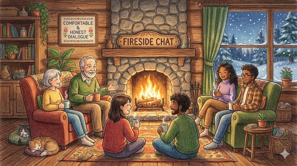 - Fireside chat: 원래는 루즈벨트 대통령이 벽난로(fireside) 옆에서 국민들에게 편안하게 라디오 연설을 한 데서 유래했습니다. 지금은 기업이나 정치에서 리더가 대중과 갖는 '격식 없고 편안한 간담회(대담)' 를 뜻합니다.
