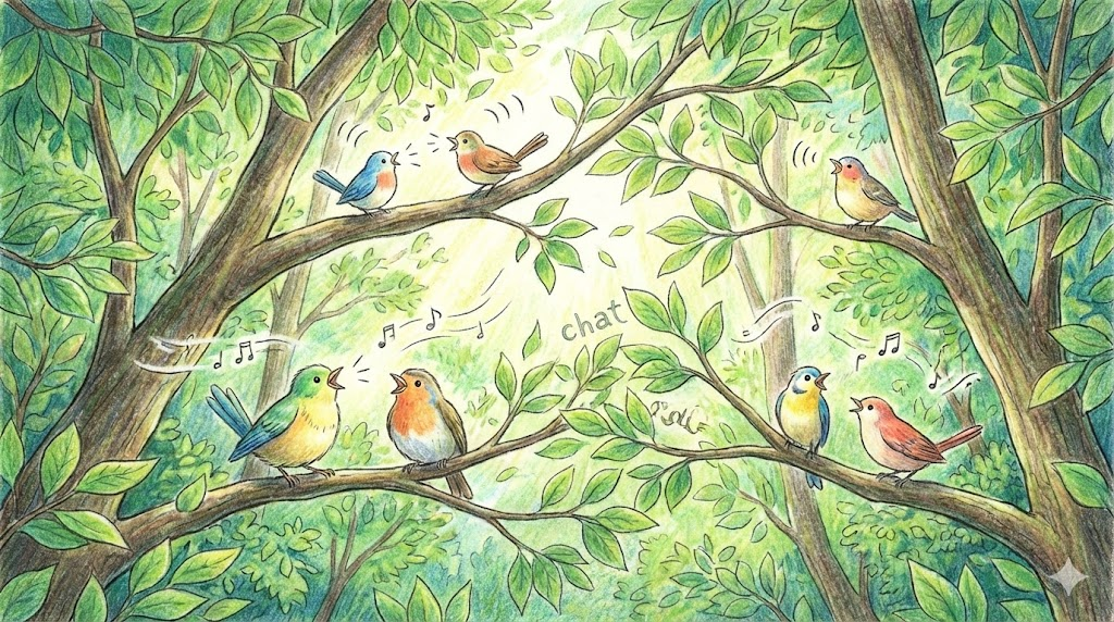 | Chatter (중세 영어) | '재잘거리다' (새 소리) | 새들이 가볍고 빠르게 우는 소리를 흉내 낸 말(의성어)에서 유래. | 가벼움/친근함 (Lightness) |