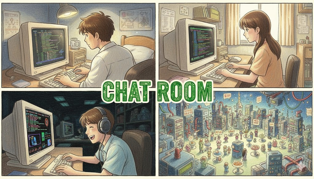 'Group chat'이 아는 사람들끼리의 메신저 방이라면, 'Chat room'은 주로 웹사이트나 게임, 커뮤니티 등에서 '익명의 불특정 다수가 모여 특정 주제에 대해 이야기하는 가상 공간' 을 뜻합니다. 90년대나 2000년대 초반의 인터넷 채팅방이나, 요즘의 디스코드 서버 내 대화방 등을 가리킬 때 씁니다.