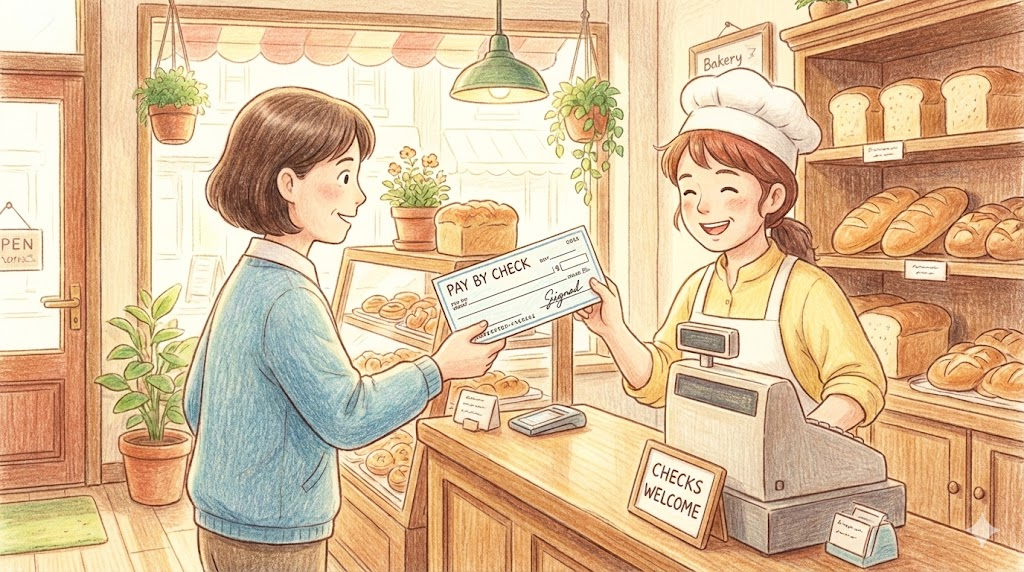 현금(Cash)이나 신용카드(Credit card) 대신, 은행에서 발행한 '개인 수표(Personal check)나 자기앞수표를 써서 돈을 내는 방식' 입니다. 미국이나 유럽 등 서구권에서는 월세, 공과금, 혹은 큰 금액을 지불할 때 여전히 흔하게 사용되는 결제 수단입니다.