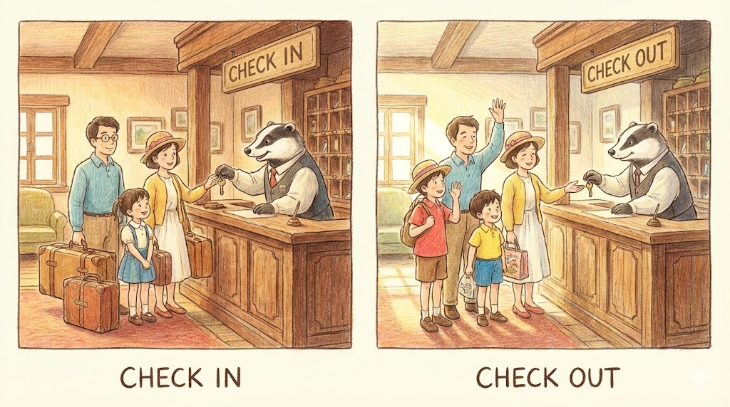 - 해석: (여행/숙박 필수) 호텔이나 공항에 도착해서 입실/탑승 수속을 하는 것(In)과, 비용을 지불하고 나가는 것(Out)입니다. 도서관에서 책을 대출(Check out)할 때도 씁니다.