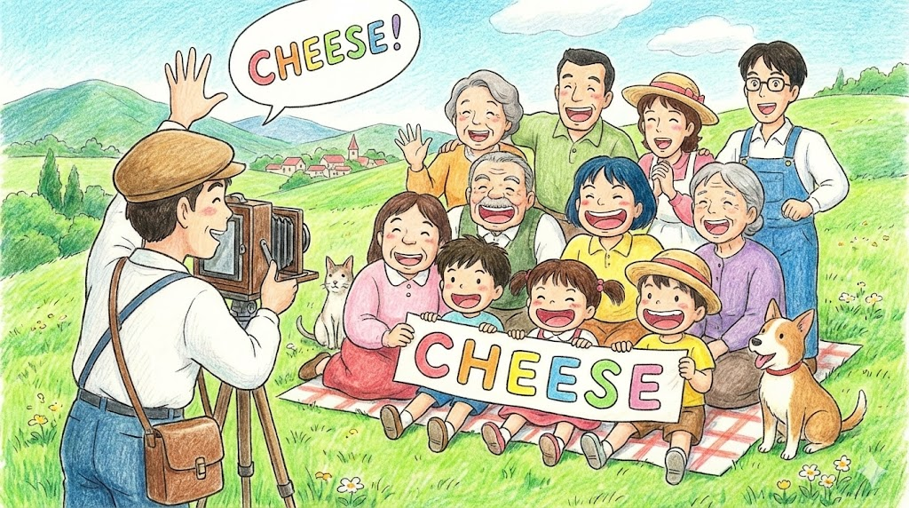 사진을 찍을 때 사람들에게 미소를 짓게 하기 위해 쓰는 말입니다. 'Cheese'의 긴 '이-(ee)' 발음을 할 때 입꼬리가 자연스럽게 올라가서 웃는 표정이 되기 때문입니다. 사진사가 "Say cheese!"라고 외치면 찍히는 사람들은 "Cheese!"라고 대답하며 포즈를 취합니다.