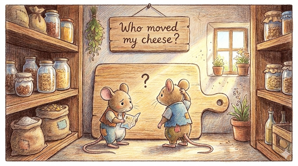 스펜서 존슨의 유명한 경영 우화 소설 제목에서 유래했습니다. 여기서 '치즈'는 우리가 인생에서 얻고자 하는 직업, 돈, 관계, 건강 등을 상징합니다. 환경이 변해서 익숙했던 보상(치즈)이 사라졌을 때, 새로운 상황에 적응하지 못하고 '과거에 집착하며 불평만 하는 태도' 를 꼬집거나, '변화를 받아들여야 한다' 는 교훈을 줄 때 인용합니다.