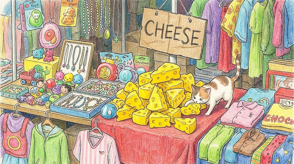 - The souvenir shop sells cheesy plastic toys. (그 기념품 가게는 조잡한 플라스틱 장난감들을 팝니다.)