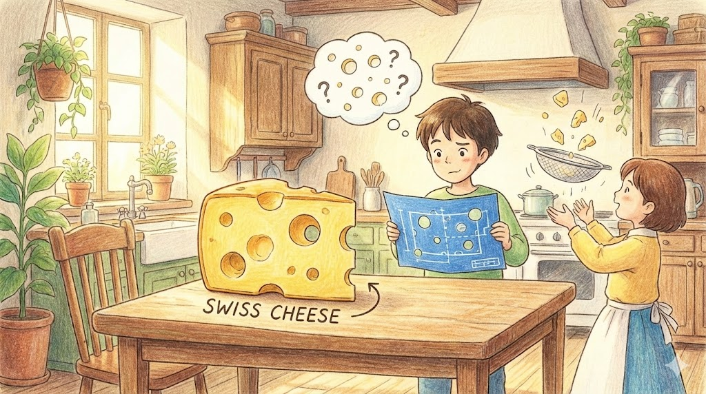 - Swiss cheese: 구멍이 숭숭 뚫린 스위스 치즈(에멘탈)처럼, 논리나 보안, 계획 등에 '허점(구멍)이 많은 상태' 를 비유합니다.