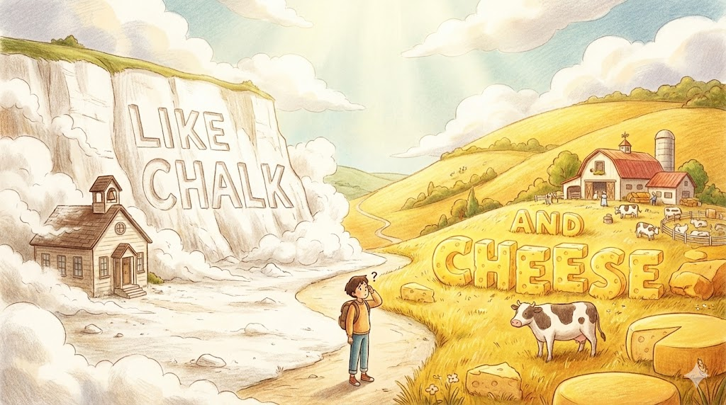 - 해석: (영국 영어/문학) 분필(chalk)과 치즈(cheese)는 겉보기엔 비슷할지 몰라도 성질은 완전히 다릅니다. 두 대상이 비교할 수 없을 정도로 아주 다를 때 씁니다. (Apples and oranges)