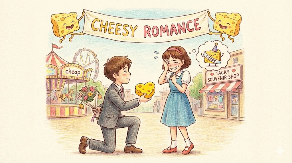 - cheesy [ˈtʃiːzi] (형용사): 치즈 맛이 나는, (속어) 유치한, 오글거리는, 싸구려의