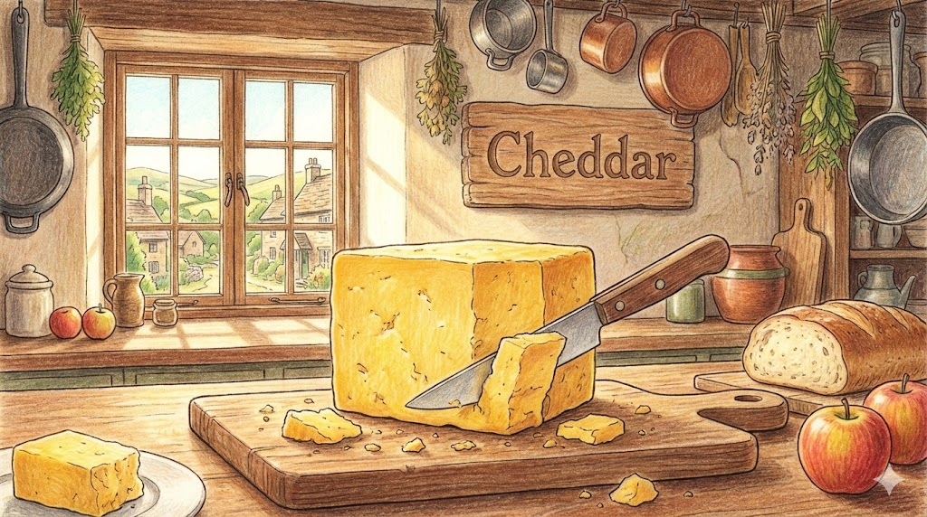 영국 서머싯(Somerset) 지방의 체다 마을에서 유래한 치즈로, 전 세계에서 가장 대중적이고 사랑받는 치즈 중 하나입니다. 우유로 만들며, 숙성 기간에 따라 맛의 깊이가 달라집니다. 샌드위치, 햄버거, 맥앤치즈 등에 가장 흔하게 쓰이는 노란색(또는 흰색) 치즈입니다.