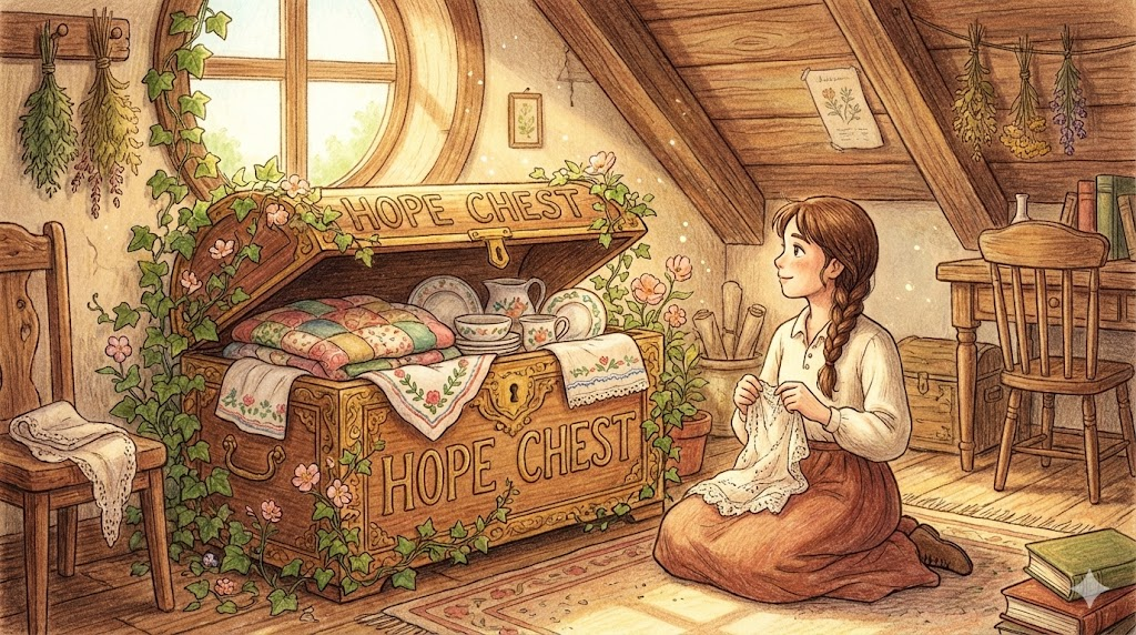 - Hope chest: 옛날 서양 풍습으로, 미혼 여성이 결혼해서 가져갈 살림살이(옷, 침구 등)를 미리 모아두던 '혼수함' 입니다. (미래에 대한 '희망'을 담은 상자)