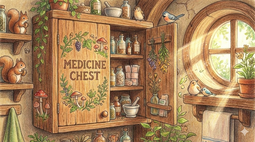 - 해석: 약이나 응급 처치 도구를 넣어두는 상자나 벽장은 'Medicine cabinet' 또는 Medicine chest라고 합니다.