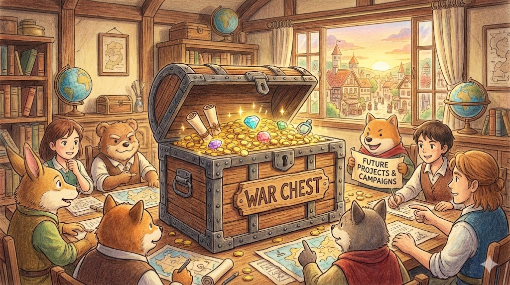 - 해석: (정치/경제) 원래는 전쟁 비용을 보관하던 상자였으나, 현대에는 선거 캠페인이나 기업의 인수 합병 등을 위해 비축해 둔 막대한 자금을 뜻합니다.