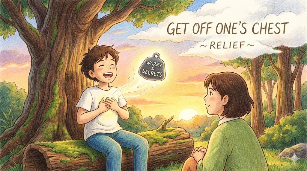 마치 가슴(Chest) 위에 무거운 돌덩이가 얹혀 있는 것처럼 답답한 걱정이나 비밀을, 누군가에게 '말해버림으로써 그 무거운 짐을 내려놓고(Get off) 마음이 홀가분해지다' 라는 의미입니다. 혼자 끙끙 앓던 고민을 친구에게 털어놓을 때 가장 자주 씁니다.