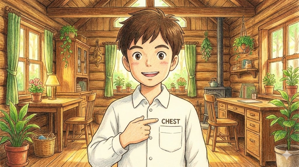 chest는 소중한 것을 안에 품고 있습니다. 몸에서는 생명을 유지하는 장기를, 방에서는 아끼는 물건을 지키는 든든한 단어입니다.