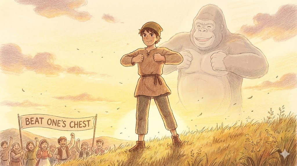 수컷 고릴라가 자신의 힘을 과시하거나 적을 위협하기 위해 가슴을 두드리는 행동에서 유래했습니다. '자신의 힘이나 승리를 뽐내며 요란하게 자랑하다' 라는 뜻으로 쓰입니다. 반면, 문맥에 따라서는 슬픔이나 후회로 인해 '가슴을 치며 통탄하다(Beat one's breast)' 라는 의미로 쓰이기도 합니다.