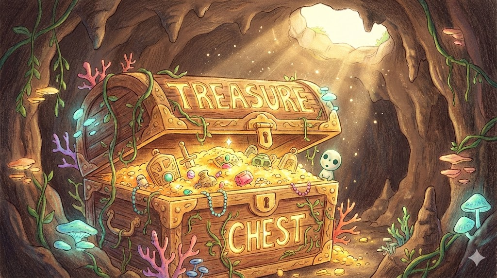 해적 영화에 나오는 금은보화가 가득 담긴 '튼튼하고 장식이 된 나무 상자' 를 뜻합니다. 일상생활에서는 유용한 정보나 귀중한 자료가 가득한 책, 웹사이트, 장소 등을 비유하여 '보물 창고(Treasure trove)' 라고 부를 때도 씁니다.