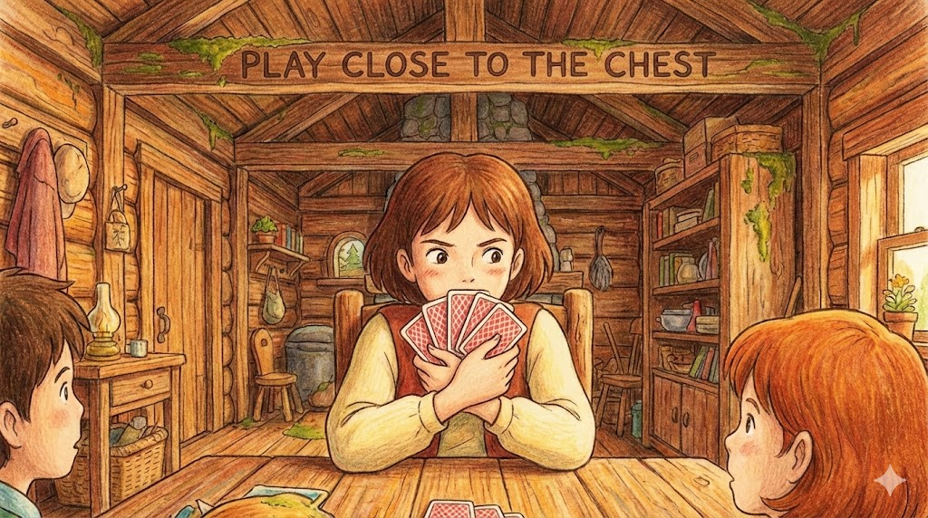 - Play close to the chest. (신중하게 행동하다 / 패를 보여주지 않다. - 카드 게임에서 남이 못 보게 카드를 가슴 쪽으로 바짝 붙여 들고 있는 모습)