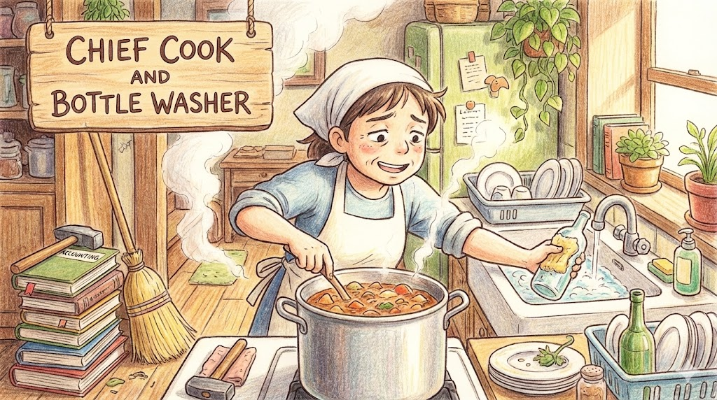 직역하면 '주방장이자 접시 닦이'라는 뜻입니다. 조직의 책임자로서 중요한 결정을 내리는 일(Chief cook)부터, 청소나 설거지 같은 아주 사소하고 힘든 일(Bottle washer)까지 '혼자서 모든 업무를 다 처리해야 하는 상황' 을 유머러스하게 표현할 때 씁니다. 주로 작은 회사 사장님이나 집안일을 도맡아 하는 가장이 자조적으로 쓸 때가 많습니다.