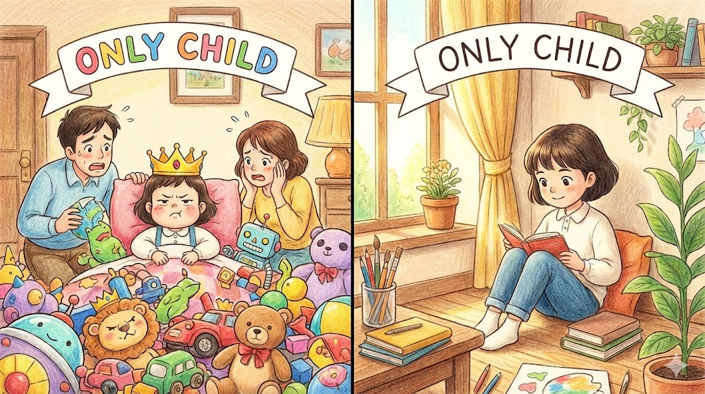 형제나 자매가 없이 '혼자 자란 아이' 를 뜻합니다. 문맥에 따라 부모의 사랑과 자원을 독차지해서 '버릇이 없다(Spoiled)'는 편견 섞인 시선으로 쓰일 수도 있고, 혼자 놀기에 익숙해서 '독립적이다(Independent)'거나 '어른스럽다(Mature)'는 뉘앙스로 쓰일 수도 있습니다.