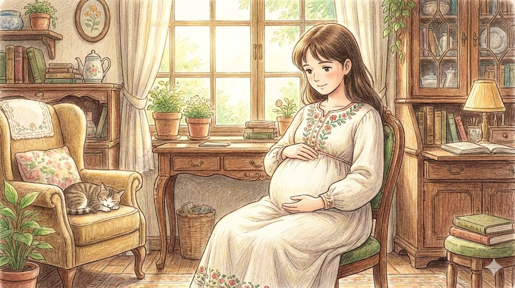 "Pregnant(임신한)"라는 단어의 '옛날식 표현(Archaic)' 이거나 문학적이고 격식 있는 표현입니다. 현대 일상 회화에서는 잘 쓰지 않으며, 고전 소설이나 성경, 혹은 아주 정중하거나 예스럽게 말할 때 사용합니다. 만삭일 때 "Heavy with child"라고 표현하기도 합니다.