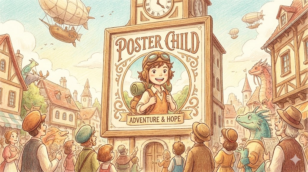 원래는 자선 단체의 포스터에 모델로 나오는 아이를 뜻했으나, 지금은 어떤 특징(좋은 것이든 나쁜 것이든)을 '가장 잘 보여주는 대표적인 사례나 인물' 을 비유적으로 이르는 말입니다. "Icon(아이콘)"이나 "Prime example(전형)"과 비슷한 뜻입니다.