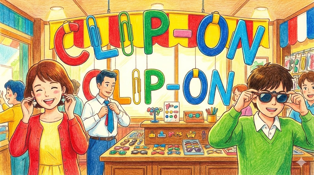 바늘이나 끈으로 묶는 대신, '집게(Clip)가 달려 있어서 옷이나 몸에 간편하게 끼웠다 뺐다 할 수 있는 장신구' 를 말합니다. 귀를 뚫지 않은 사람을 위한 귀걸이(Clip-on earrings), 매듭을 맬 필요가 없는 넥타이(Clip-on tie), 안경 위에 덧쓰는 선글라스(Clip-on sunglasses) 등에 쓰입니다.