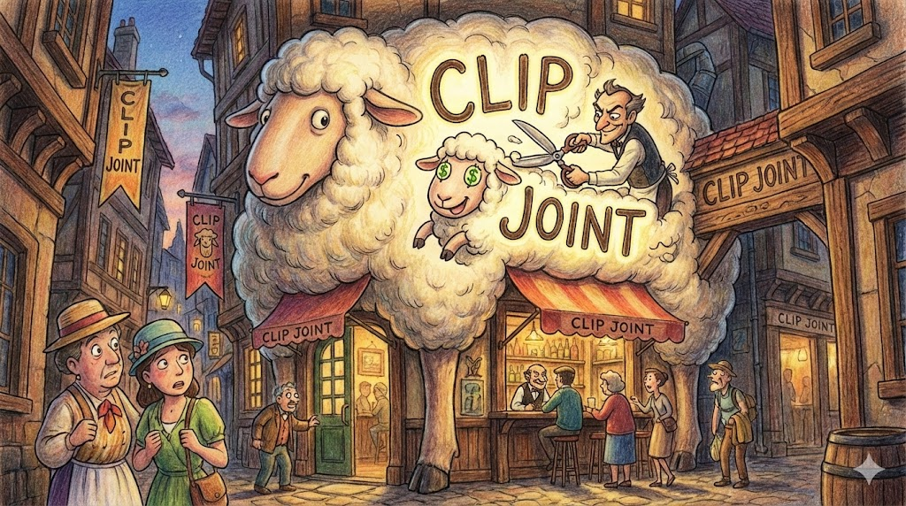 손님에게 술값이나 서비스 요금을 '터무니없이 비싸게 청구하여 바가지를 씌우는 유흥업소' 를 말하는 속어입니다. 양털을 깎듯이(Clip) 손님의 돈을 싹 깎아먹는다는 뜻에서 유래했습니다. 주로 관광객을 노리는 악질적인 가게를 가리킬 때 씁니다.