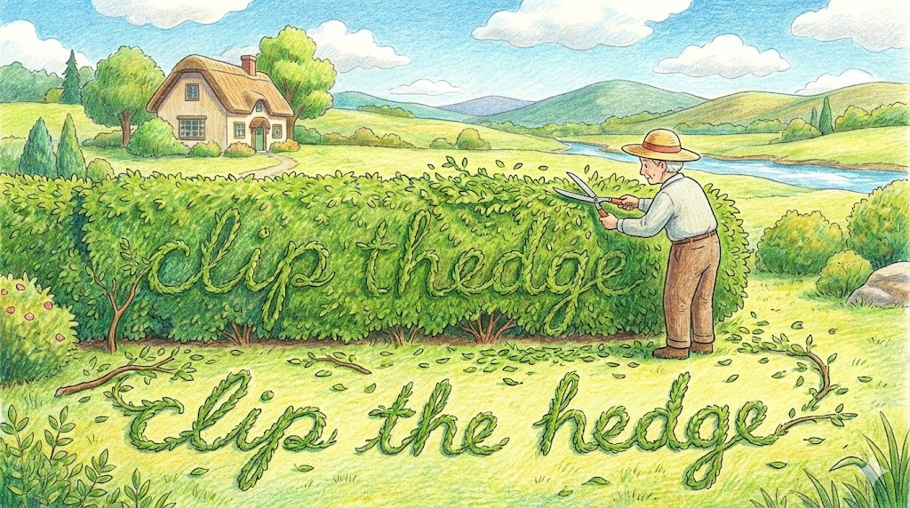 가위나 기계(Clippers)로 정원이나 집 주변의 나무 울타리(Hedge)를 '반듯하고 깔끔한 모양으로 잘라내는 것' 을 말합니다. 단순히 가지를 자르는 것(Cut)이 아니라, 모양을 예쁘게 다듬는(Trim) 작업에 가깝습니다.