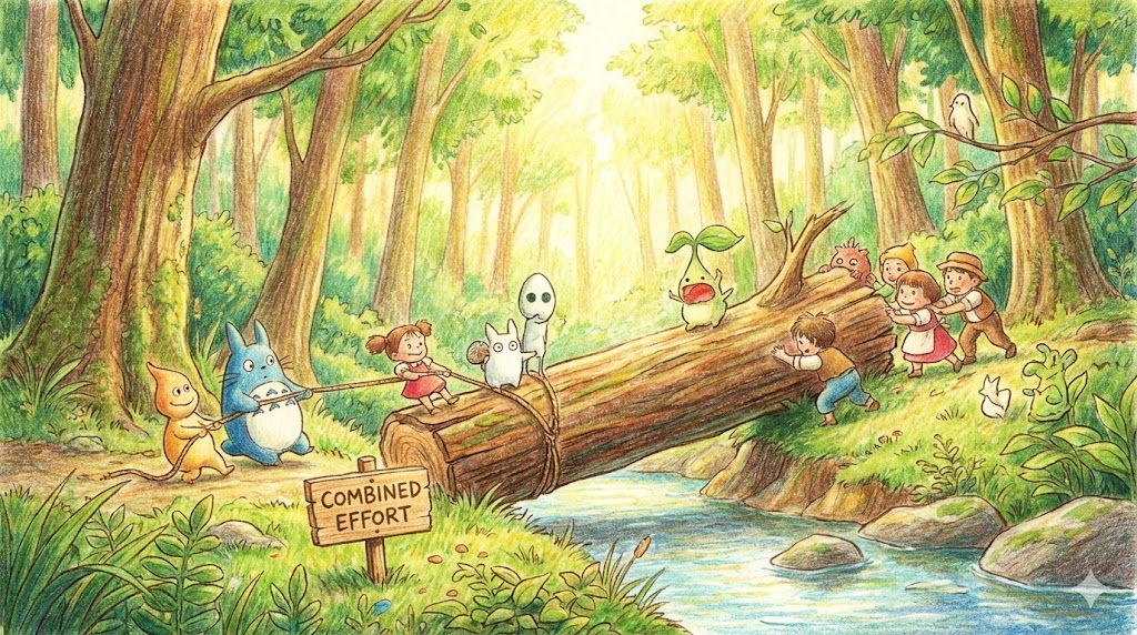 - 해석: 혼자가 아니라 여러 사람이 함께 노력해서 만든 결과를 강조할 때 씁니다.