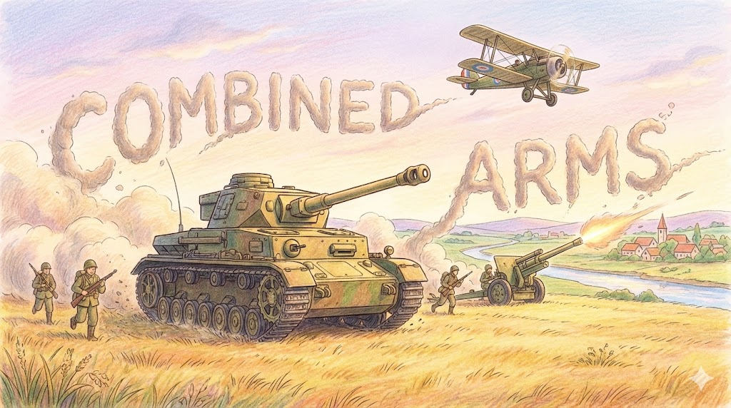 - Combined arms: 보병, 포병, 기갑 부대 등 서로 다른 병과(arms)가 서로를 보완하며 싸우는 '제병 협동(합동 작전)' 입니다.