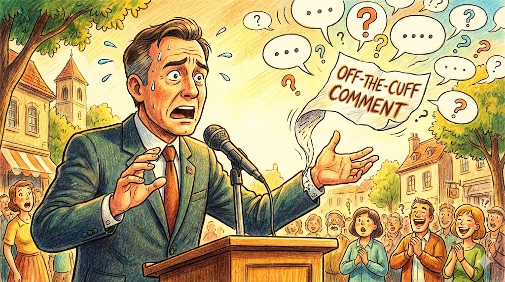 옛날에 연설가들이 급하게 메모해야 할 때 셔츠 소매 끝동(Cuff)에 적어서 몰래 보던 것에서 유래했습니다. 대본이나 사전 준비 없이 '현장에서 즉흥적으로 하는 말' 을 뜻합니다. 때로는 솔직하고 자연스러운 매력이 있지만, 정치인이나 공인이 신중하지 못하게 내뱉어서 '말실수' 가 되는 부정적인 상황에서 자주 쓰입니다. "Spontaneous(자발적인)"보다는 좀 더 가볍고 준비 부족의 뉘앙스가 있습니다.