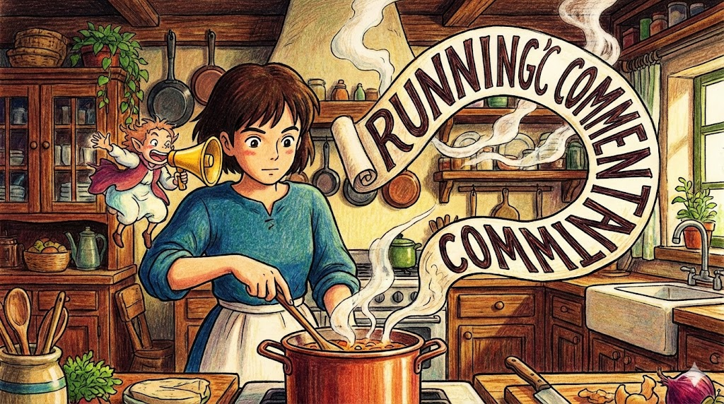 - Running commentary. (실황 중계. - 사건이 진행되는 동안 계속해서(Running) 설명을 덧붙이는 것)