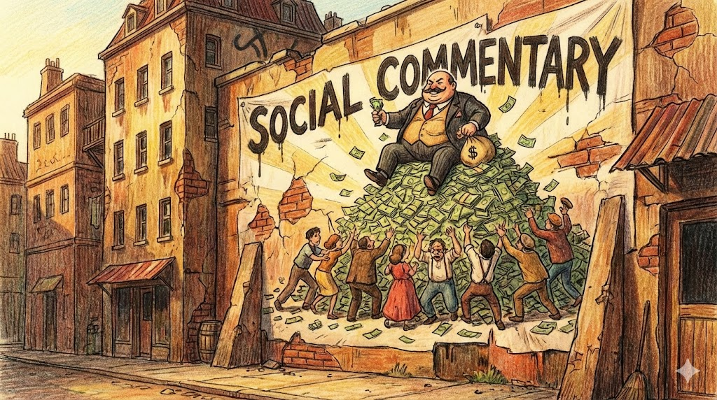 단순히 재미를 위한 것이 아니라, 소설, 영화, 그림, 노래 등의 예술 작품이 '사회의 부조리, 불평등, 정치적 문제 등을 꼬집고 비판하는 메시지를 담고 있을 때' 씁니다. 작가가 작품을 통해 "우리 사회는 이래서 문제다"라고 발언하는 것을 고상하게 표현한 말입니다. 뱅크시(Banksy)의 그래피티나 영화 <기생충> 같은 작품들이 강력한 social commentary를 담고 있다고 평가받습니다.