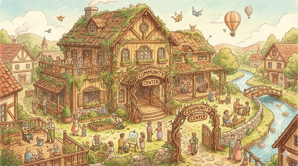 동네 사람들이 모여서 다양한 활동을 할 수 있도록 지자체나 단체에서 운영하는 '공공 건물' 입니다. 단순히 행정 업무만 보는 곳이 아니라, 요가나 수영 같은 운동 강좌, 취미 교실, 노인 복지 프로그램, 청소년 모임 등이 열리는 '동네 사랑방' 역할을 하는 곳입니다. 사람들이 서로 어울리고 소통하는 물리적인 공간을 의미합니다.