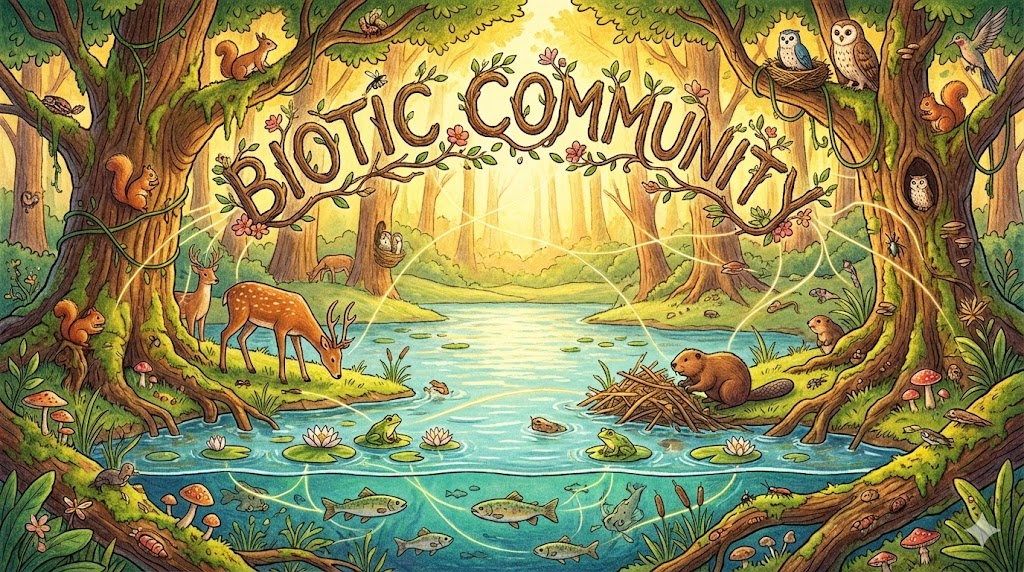 - Biotic community: 생태학 용어로, 특정 지역에 사는 모든 생물(동물, 식물, 미생물)의 집합, '생물 군집' 입니다.