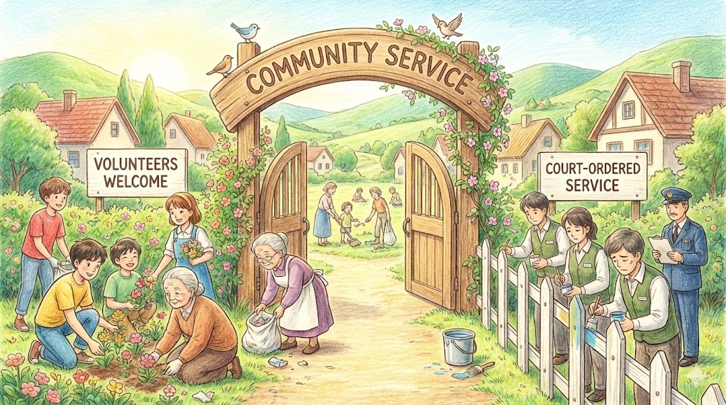- 해석: (교육/입시 필수) 학교나 법원의 명령으로, 혹은 자발적으로 지역 사회를 위해 무보수로 일하는 활동입니다.