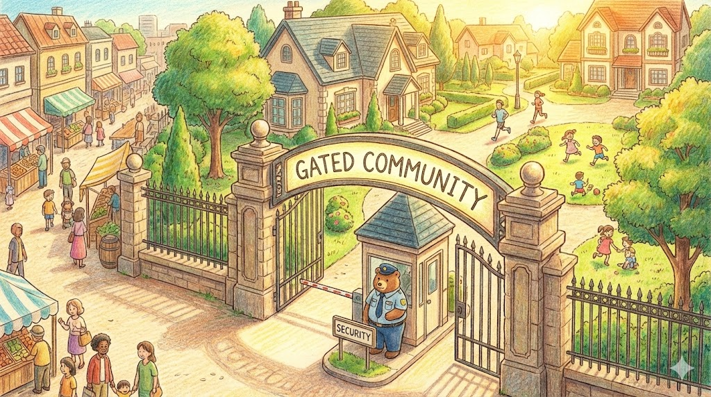단지 입구에 대문(Gate)이 있고 경비원이나 보안 시스템이 지키고 있어, '허가받지 않은 외부인은 들어갈 수 없는 폐쇄적인 주거 구역' 을 말합니다. 주로 부유층이 사는 곳으로, 범죄로부터 안전하고 쾌적하다는 '안전함과 배타성(Exclusivity)' 을 동시에 상징합니다. 하지만 이웃과 단절된 '그들만의 세상'이라는 비판적인 시각도 존재합니다.