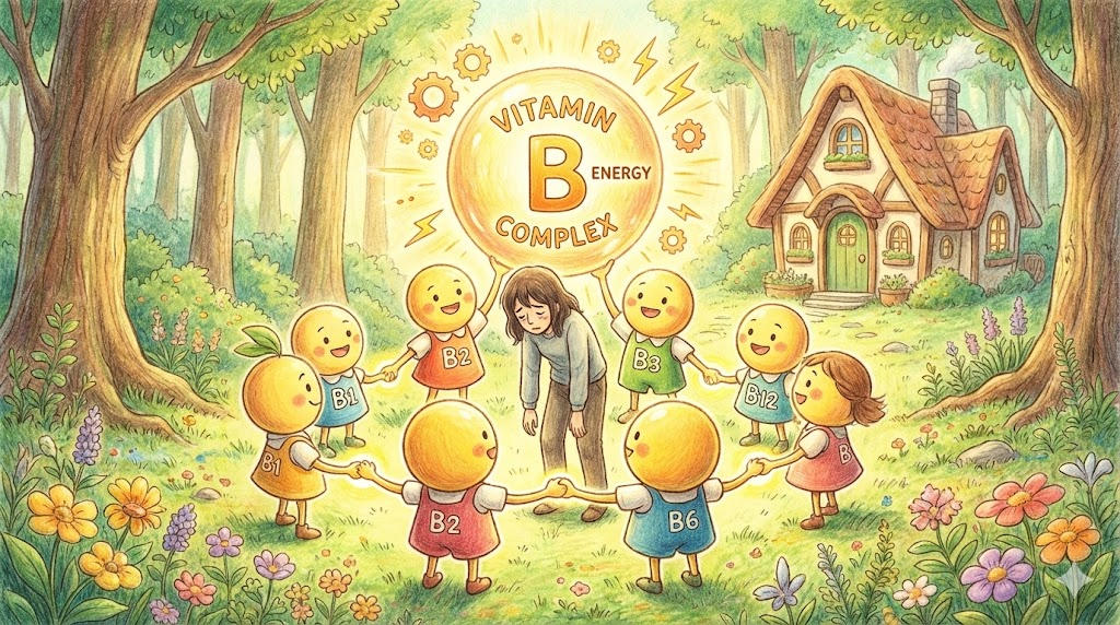 비타민 B는 하나가 아니라 B1, B2, B3, B6, B12 등 총 8가지 종류가 있습니다. 이들은 우리 몸의 에너지 대사와 신경계 건강을 위해 '서로 도우며 팀으로 일하는 경우가 많아서' 보통 한꺼번에 묶어서 부릅니다. 영양제를 살 때 "Vitamin B"라고만 쓰여 있는 것보다 "Complex"가 붙어 있는 제품이 골고루 들어 있다는 뜻입니다. 피로 회복에 특히 좋습니다.