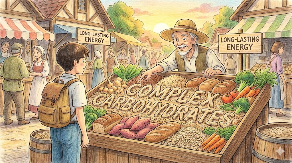 - Complex carbohydrates: 설탕 같은 단순 당(Simple carbs)이 아니라, 사슬 구조가 복잡하게 얽혀 있어 소화가 느린 '복합 탄수화물(전분/식이섬유)' 입니다. (예: 통곡물, 고구마 - 건강에 좋음)