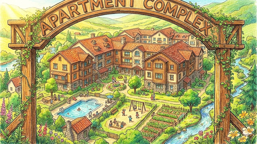 달랑 건물 한 채만 있는 것이 아니라, 여러 동의 아파트 건물들이 모여 있는 '대규모 주거 단지' 를 말합니다. 한국의 '아파트 단지' 개념과 정확히 일치하며, 보통 수영장, 헬스장, 놀이터, 주차장 같은 편의 시설(Amenities)을 입주민들이 공유합니다.
