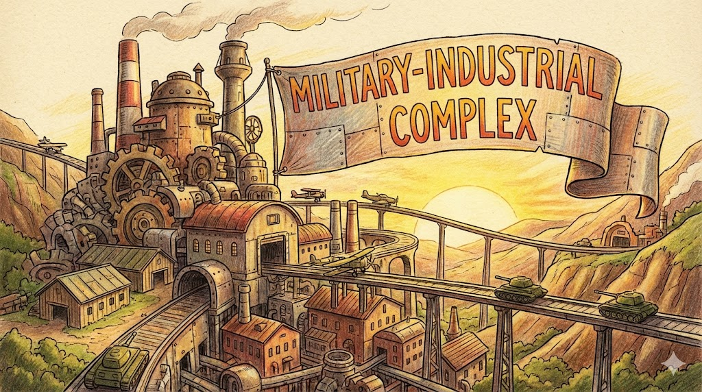 전쟁을 수행하는 '군대(Military)' 와 무기를 만드는 '방위 산업체(Industry)' 가 서로 이익을 위해 결탁한 거대한 세력을 말합니다. 미국의 아이젠하워 대통령이 퇴임 연설에서 "이들이 돈을 벌기 위해 전쟁을 부추기거나 국가 정책을 좌지우지할 위험이 있다"고 경고하면서 유명해진 정치·사회적 용어입니다.