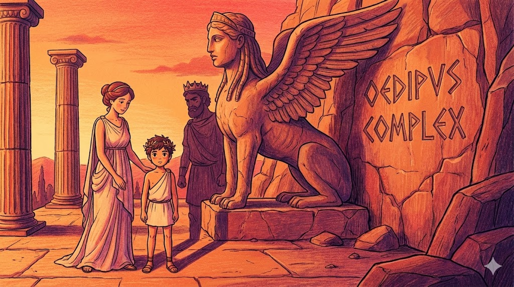 프로이트 심리학의 가장 유명한 개념 중 하나입니다. 어린 아들이 '어머니를 이성으로 사랑하고, 아버지를 경쟁자로 여겨 질투하거나 적대시하는 무의식적인 심리' 를 말합니다. 그리스 신화에서 아버지를 죽이고 어머니와 결혼한 오이디푸스 왕의 이야기에서 따왔습니다. 반대로 딸이 아버지를 사랑하고 어머니를 질투하는 것은 '엘렉트라 콤플렉스(Electra complex)'라고 합니다.