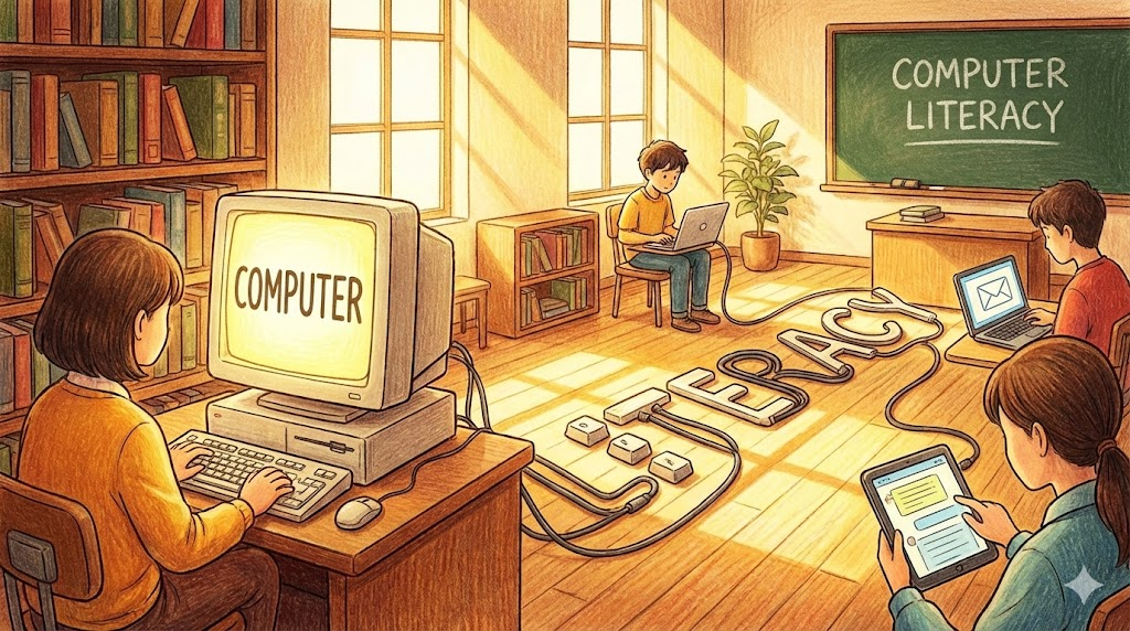 - 해석: (교육/취업 필수) 글을 읽고 쓰는 능력(Literacy)처럼, 컴퓨터를 다룰 줄 아는 능력을 말합니다. 반대로 컴맹은 Computer illiteracy라고 합니다.