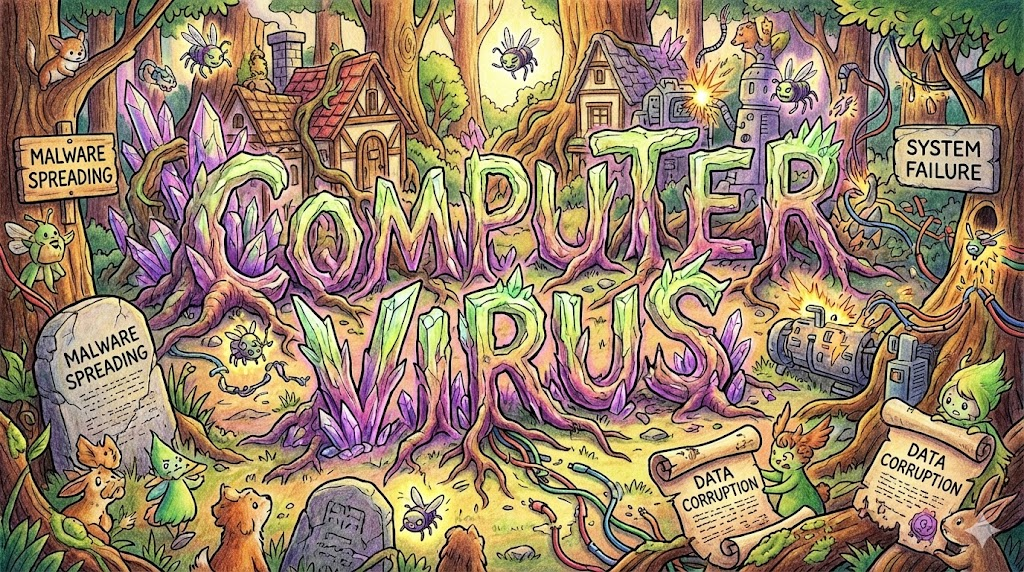 생물학적인 바이러스가 사람의 몸에 침투해 병을 일으키고 전염되는 것처럼, 컴퓨터 프로그램에 몰래 숨어들어 시스템을 망가뜨리거나 데이터를 훔치는 '악성 프로그램' 을 말합니다. 스스로를 복제하여 다른 파일로 퍼져나가는 특성이 있어 '감염(Infection)'된다고 표현합니다.