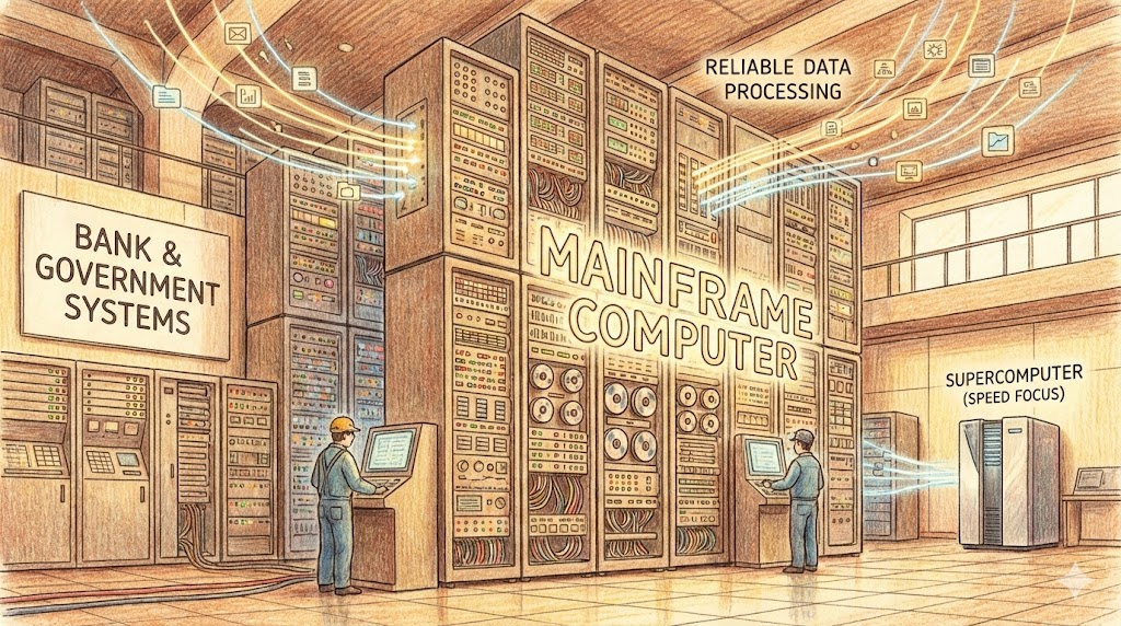 - 해석: (산업/비즈니스) 은행이나 대기업에서 방대한 데이터를 처리하기 위해 사용하는 거대한 서버급 컴퓨터입니다. PC와 대비되는 개념입니다.