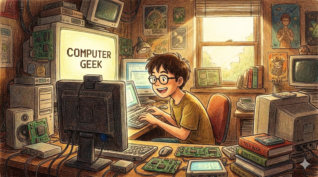 - 해석: (회화/문화) 컴퓨터나 기술에 푹 빠져 살거나 전문가 수준의 지식을 가진 사람을 부르는 말입니다. (Nerd/Techie)