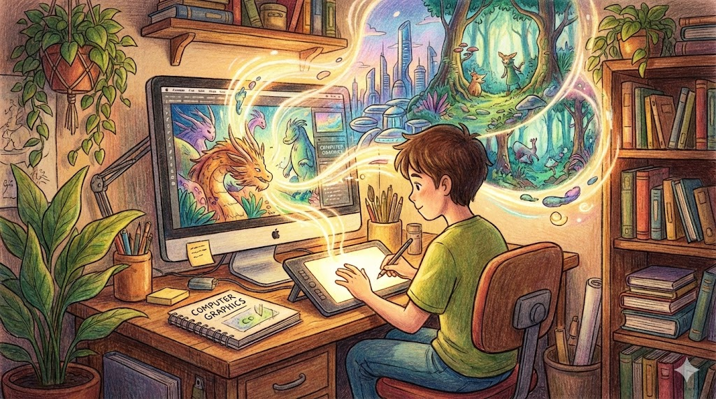 - 해석: (영화/예술) 컴퓨터 프로그램을 이용해 만든 이미지나 영상입니다. 영화의 특수 효과(VFX)에 필수적입니다.