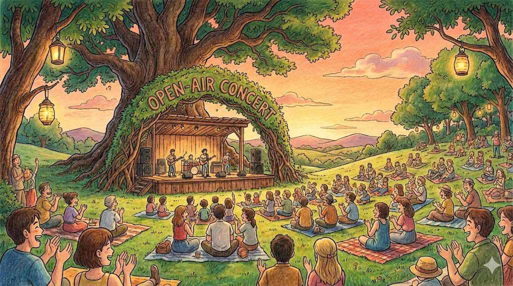 - 해석: 실내가 아닌 공원이나 광장 등 탁 트인 야외에서 열리는 공연입니다. (Outdoor concert)